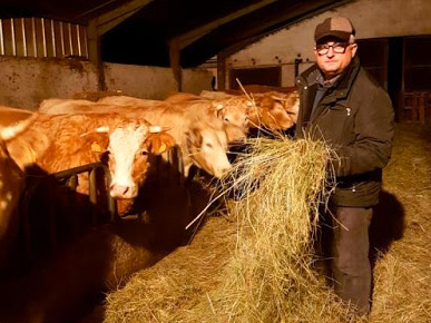 Bœuf : foin sec, herbe fraîche, et céréales de France (si besoin pour la finition de gras intramusculaire).